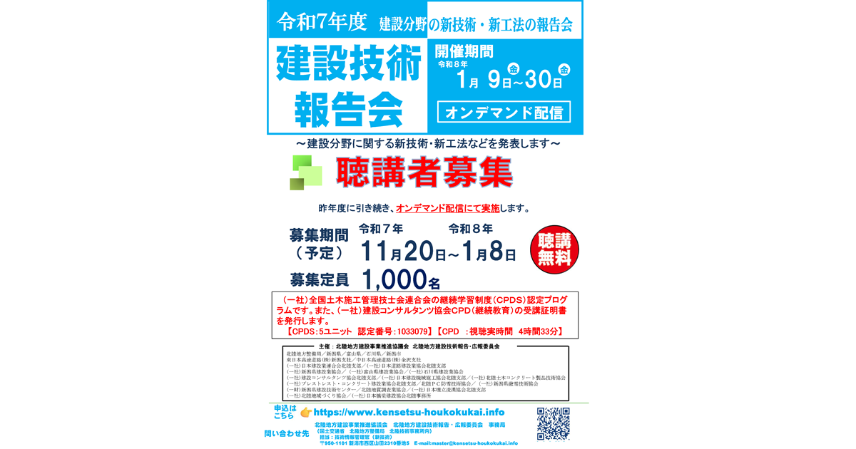 「令和7年度建設技術報告会」は北陸地方における建設事業の円滑な推進のため、官公庁及び民間の建設会社において研究開発された新技術・新工法等の普及を図ることを目的として毎年開催されており、今回で30回目の開催となります。