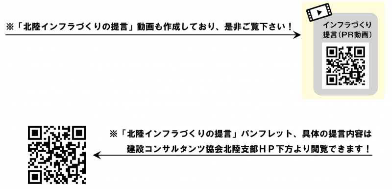 北陸支部では、本提言の内容がターゲットである若者に伝わるようなデザインや構成を工夫したパンフレットと動画を製作しました。ホームページやユーチューブ、SNSでの配信のほか、土木出張PR(新潟県内中学校等での広報活動)や専門大学・工業高等専門学校等でのPR、経済界への配布を予定しており、これら活動を通じて建設コンサルタントの認知度やイメージ向上につながるものと願っています。