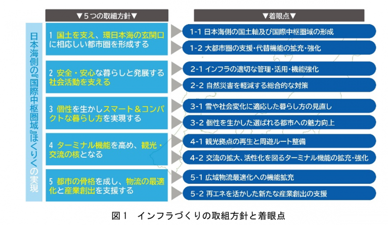 北陸のインフラづくりの目標像を「日本海側の『国際中枢圏域ほくりく』」とし、それを実現するための取組方針を5つ設定した上で、あわせて10の着眼点を掲げました(図1)。その着眼点についての考え方を示すとともに、それぞれに掲げた計31のインフラメニューに対し、建コン北陸支部が考える推進すべき取組を具体的に提言しました。