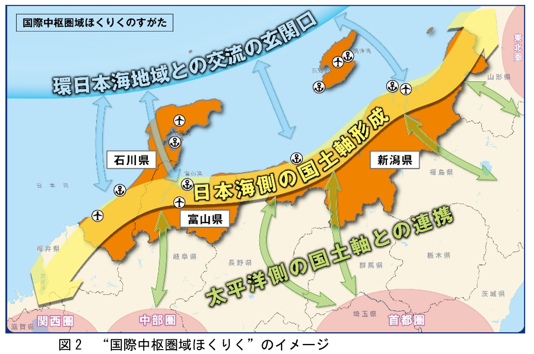 各インフラメニューの実施によって、30年後に新潟・富山・石川の3県が今以上に連携・一体化し、1つの圏域「国際中枢圏域ほくりく」として機能していく姿をイメージ図(図2)で描きました。
