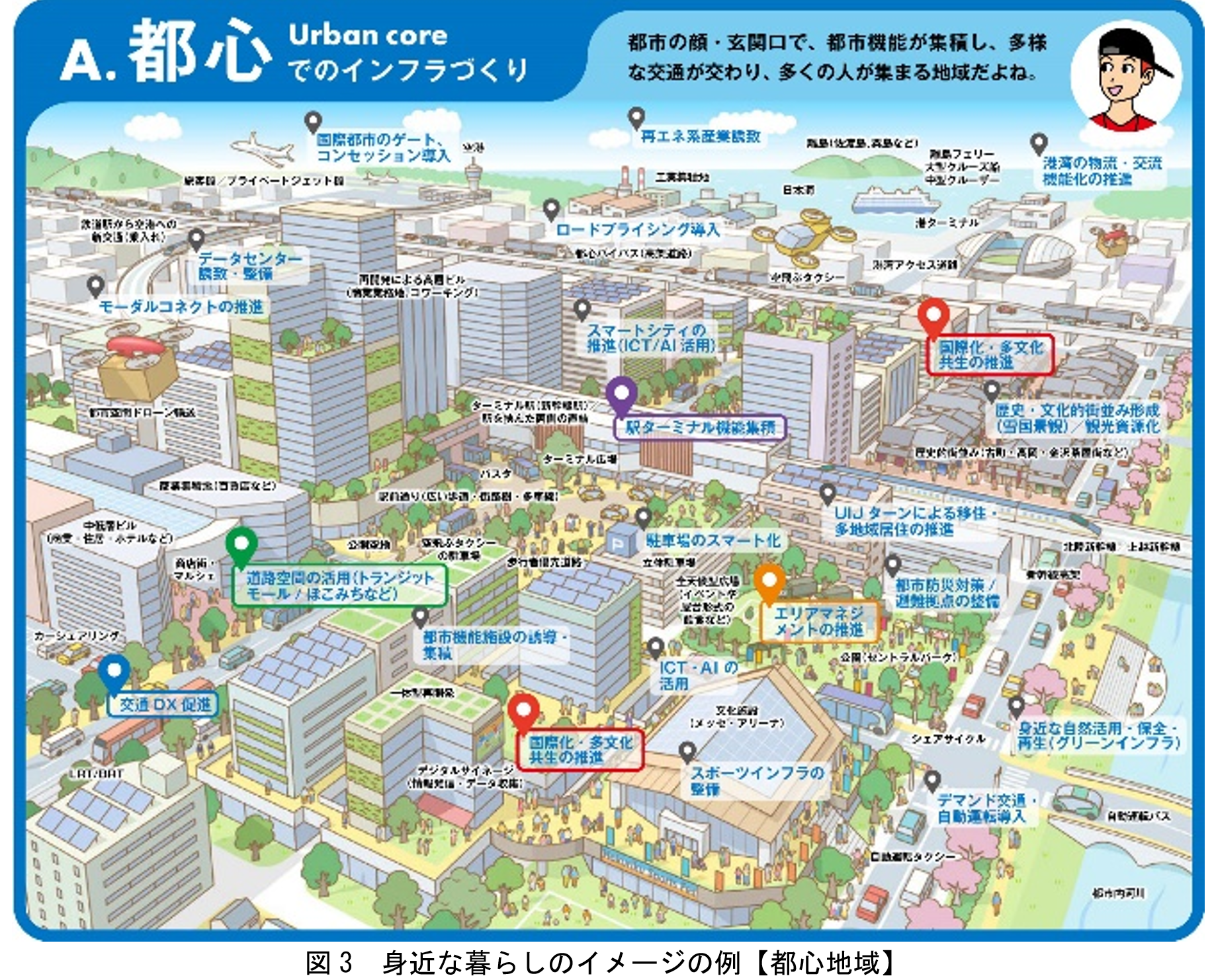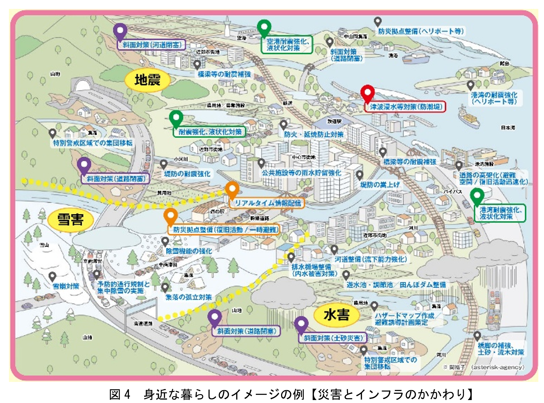 また日常の生活者の目線から、30年後の暮らしとインフラの関わり(取組イメージ)を「都心」「近郊」「集落地等」の3つの地域ごとに、加えて災害とインフラとの関わりを地震・水害・雪害の3つの災害から、それぞれイメージ図(図3,4)を描きました。