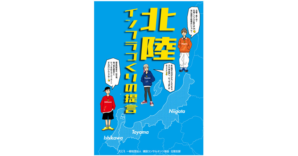 かつては人口日本一の時代もあった北陸地域では、特に若者の人口流出に歯止めがかからず、建設業界の担い手確保のみならず若者の人口流出抑制が大きな課題になっています。このため、インフラ整備の上流側から携わる建設コンサルタントとして、夢のある「北陸の将来の姿」をインフラづくりの観点からメッセージとして『北陸インフラづくりの提言』を作成しました。 この提言は、北陸の地域づくりに貢献する技術者集団として、おおむね『30年先』の将来を 見据え、地域課題の改善・解決に向けた構想(考え方と具体 策)を提案したものです。未来を担う若い皆さんとともに、その実現を目指していきたいと考えています。