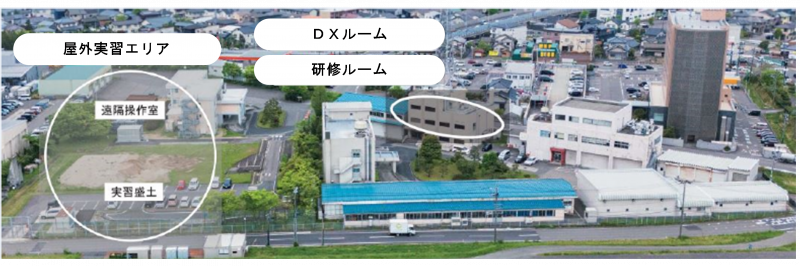 当センターは3つの施設で構成されており、①各種シミュレータを備えた「DXルーム」、②3次元データモデルの作成やICT施工に関する研修を行うための「研修ルーム」、③遠隔操縦対応型バックホウの遠隔操作実習や盛土施工体験ができる「屋外実習エリア」を、広く一般に開放し「DX体験」の提供を行っています。