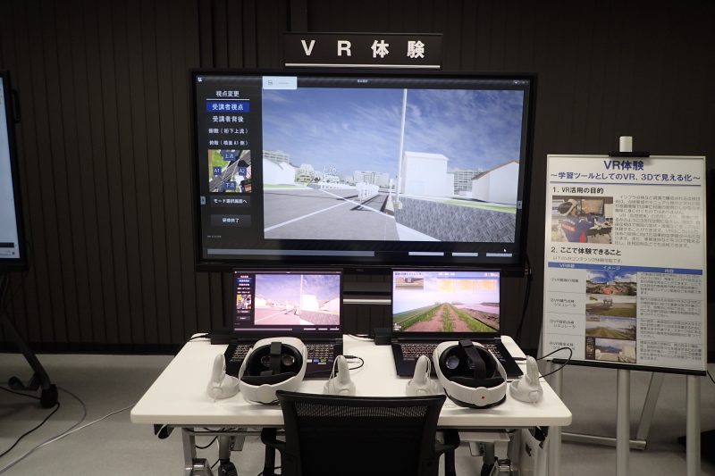 VRゴーグルを装着し、VR空間内で堤防や樋門等の河川構造物や、橋梁の点検を体験することができます。