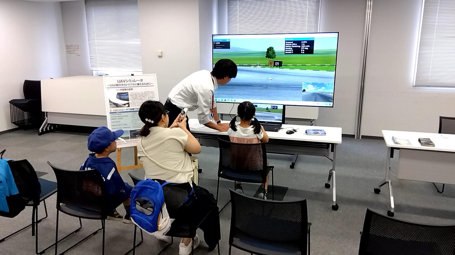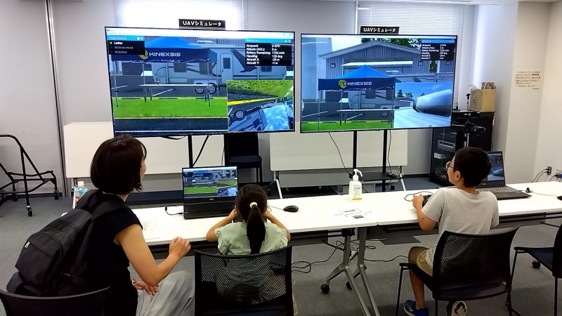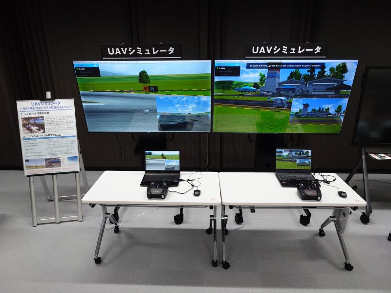 UAV(ドローン)の実製品を再現したコントローラを用いて、場所や天候を気にせず、モニター上でUAV操作を体験することができます。また、本体に異常が発生した際の挙動を体験することもできます。
