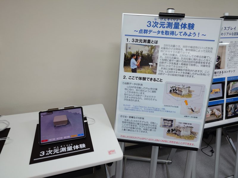 LiDAR機能が搭載されたタブレット端末を用いて、構造物等を三次元的にスキャンし、作成した3Dモデルから寸法等を測定する体験ができます。