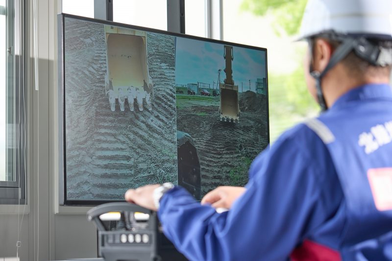 遠隔操作室から直接目視による操作、または室内のモニターを見ながら操作を行います。ICT施工(2Dマシンコントロール)の体験も可能です。