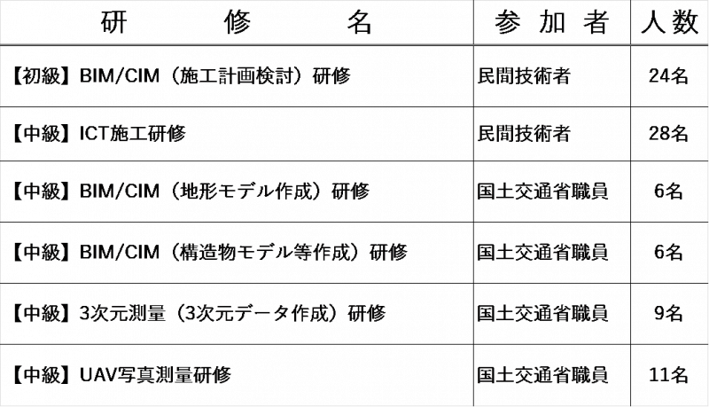研修ルームでは、建設分野の各段階におけるDX技術を学ぶことができる研修を行っています。令和6年度には、初級から中級者を対象にした研修を計6回開催しました。