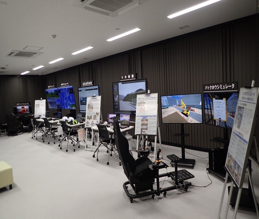 当センターは3つの施設で構成されており、①各種シミュレータを備えた「DXルーム」、②3次元データモデルの作成やICT施工に関する研修を行うための「研修ルーム」、③遠隔操縦対応型バックホウの遠隔操作実習や盛土施工体験ができる「屋外実習エリア」を、広く一般に開放し「DX体験」の提供を行っています。