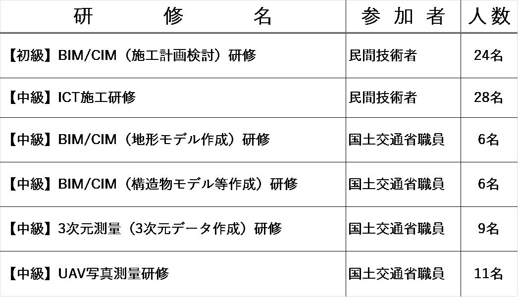 研修ルームでは、建設分野の各段階におけるDX技術を学ぶことができる研修を行っています。令和6年度には、初級から中級者を対象にした研修を計6回開催しました。