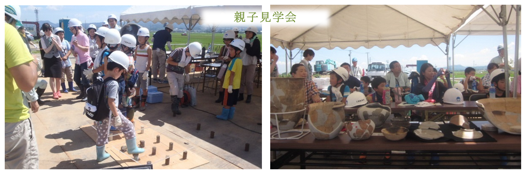 また、地域の子供たちに普段あまり見ることのない貴重な機会に触れてもらおうと、遺跡調査現場と工事現場の親子見学会を開催し、多くの方から参加いただきました。