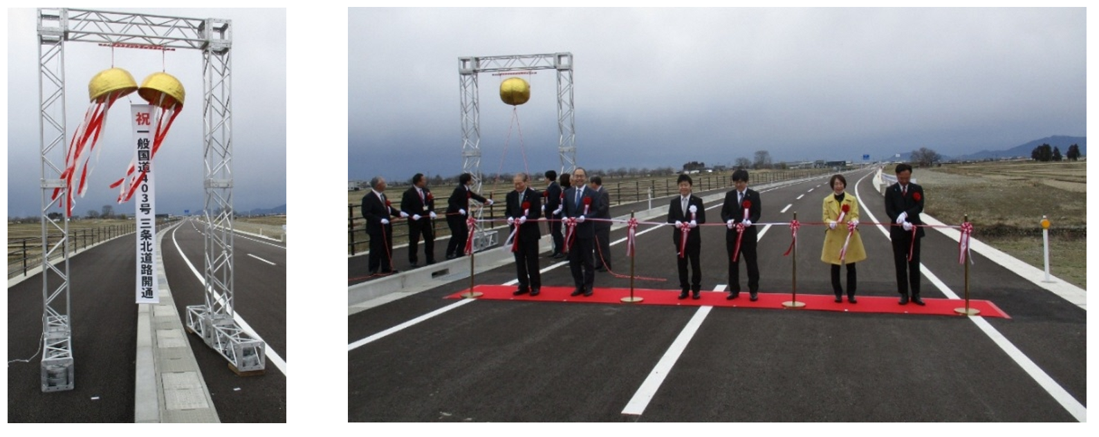 三条北道路の完成に至るまで、非常に多くの方からご協力いただきました。事業の推進にご尽力いただきました関係者の皆様、長期間の工事にご理解・ご協力いただきました地域の皆様など、長きにわたり支えてくださいました皆様に、この場を借りて感謝申し上げます。また、開通直前は、県央地域の医療の要となる済生会新潟県央基幹病院の開院に合わせての開通を目標に、施工・工程調整等工事関係者の皆様のご尽力のもと、開院と同時期に開通させることができました。重ねて感謝申し上げます。