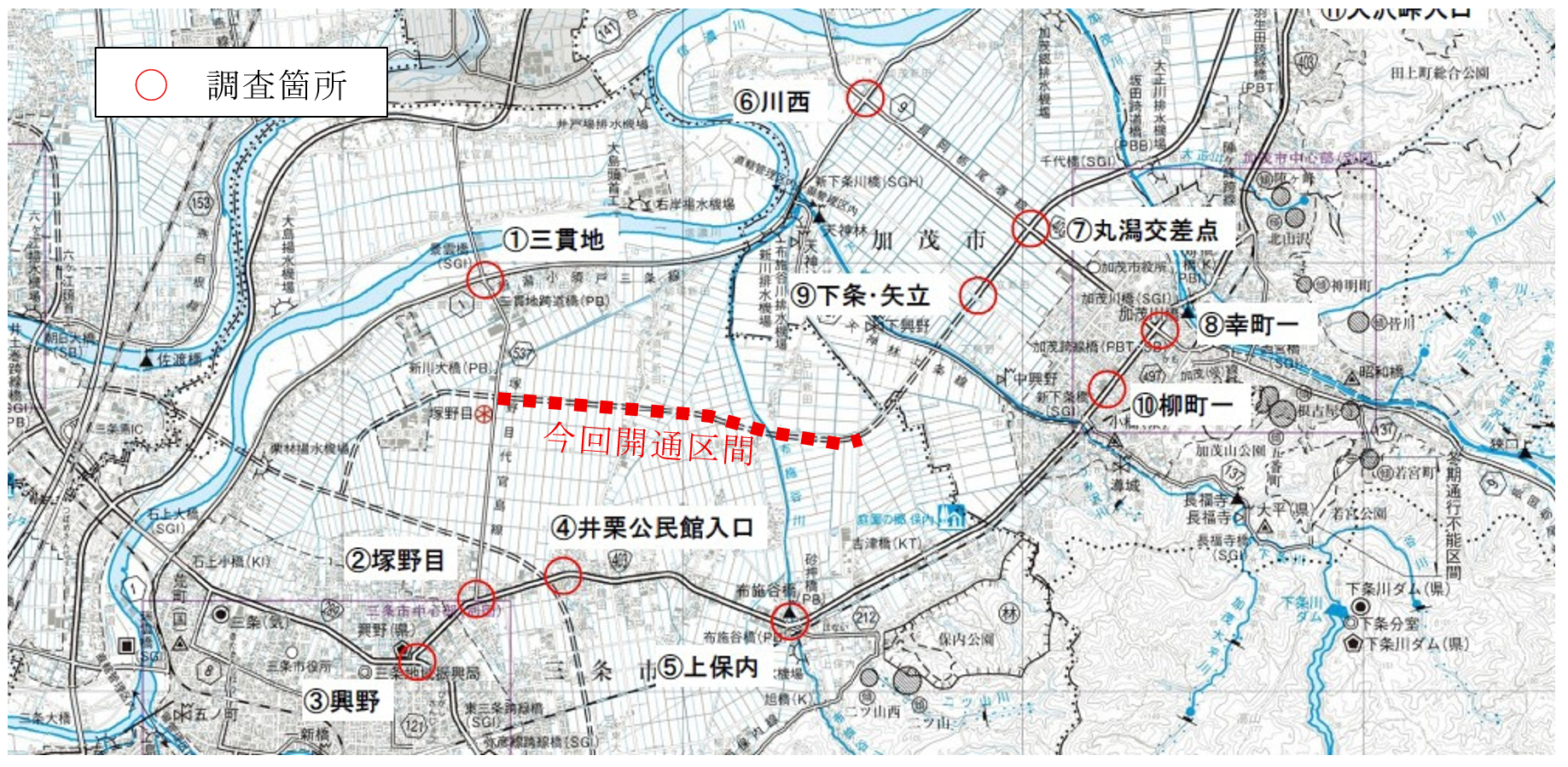 三条北道路開通の効果を確認するため、交通量調査を実施しました。調査は、今回開通した区間周辺の主要交差点において、7時~19時の12時間の交通量を計測し、そのうち7時~10時及び16時~19時の6時間では渋滞長も計測しました。