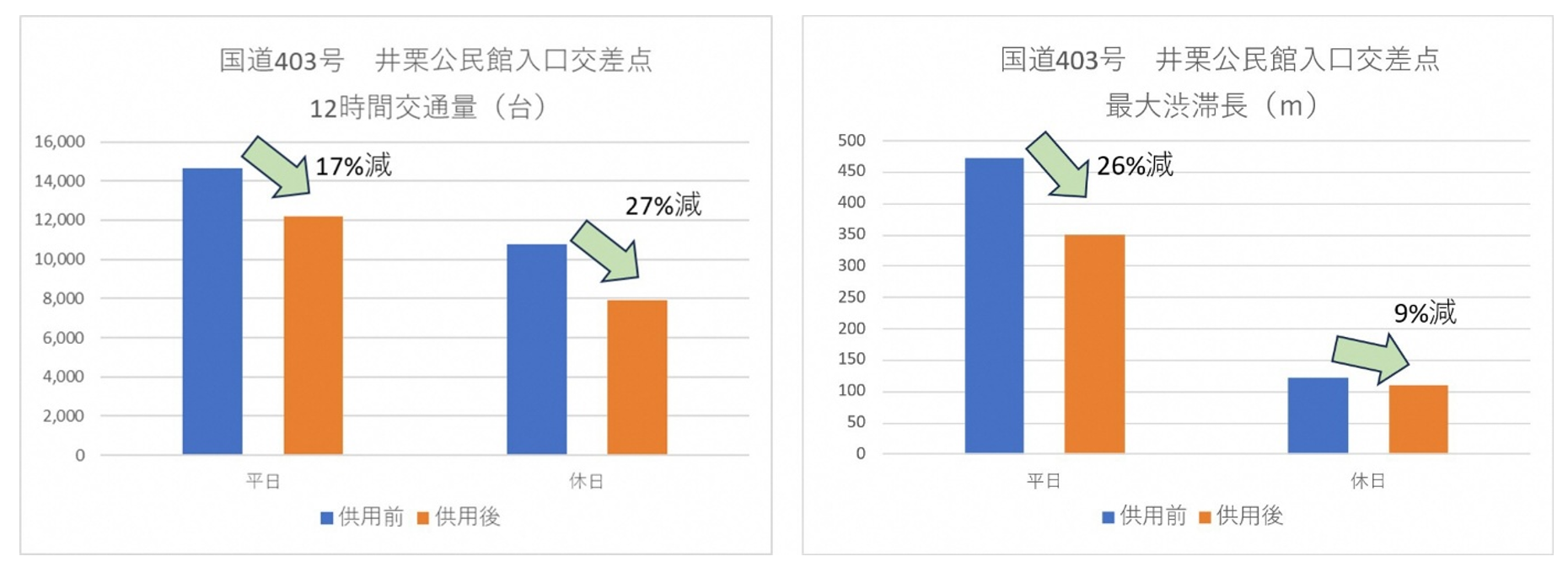バイパスの開通により、国道403号の「井栗公民館入口」交差点では、交通量が平日で17%、休日で27%減少し、最大渋滞長は平日で26%、休日で9%減少しました。