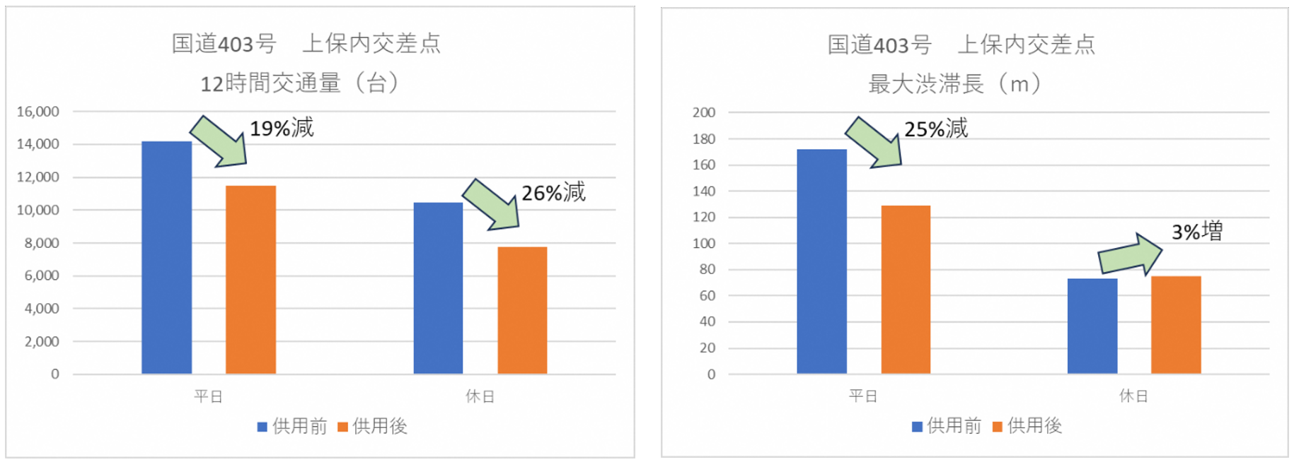 同じく国道403号の「上保内」交差点でも、交通量が平日で19%、休日で26%減少し、最大渋滞長は、平日で25%減少しています。