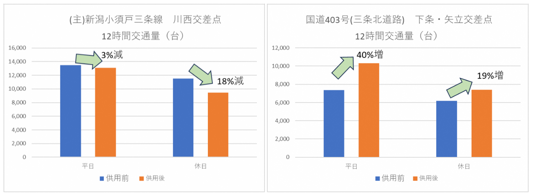 また、バイパスの北側に並行している主要地方道新潟小須戸三条線の「川西」交差点においても、平日で3%、休日で18%減少する結果となりました。一方、三条北道路の「下条・矢立」交差点では、平日で40%、休日で19%増加しました。これは、以前はバイパスが行き止まりだったことで、「丸潟」交差点から並行する周辺道路へ流れていた交通が、今回の開通を以ってバイパスを利用する交通に切り替わったものと考えられます。
