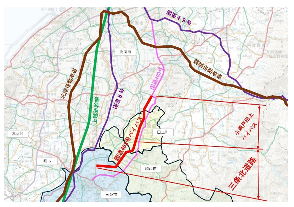 国道403号は、新潟市を起点に、田上町、加茂市、三条市を経由し、長野県松本市に至る延長350㎞の幹線道路です。昭和50年代、この地域周辺では北陸自動車道や上越新幹線が開通したほか、磐越自動車道の建設などが進められていました。そこで、来たる高速交通時代に即応できるようにするため、当時、県道だった新潟新津三条線の国道昇格と早期バイパス化を目指し、昭和57年に国道認定(新潟市江南区~三条市)されました。県央地区の信濃川右岸側を南北に結ぶ区間は、この地域にとって、北陸自動車道や上越新幹線などの高速交通体系に連絡する産業経済の動脈として、あるいは通勤通学等の生活道路として欠くことのできない重要な道路となっています。しかし、各所で渋滞が発生し社会経済活動に支障をきたしているほか、幅員狭小で歩道未整備区間も多くあり、朝夕は通勤通学の車と歩行者が混在し、安全な通行が確保されているとは言えません。このような状況を解消するため、国道403号のバイパス整備に着手(昭和59年度に「三条北道路」、平成8年度に「小須戸・田上バイパス」)しました。また、本路線は第2次緊急輸送道路に指定されていますが、平成23年の新潟福島豪雨の際には冠水する区間が発生する等、避難や救命・救急活動において防災上の課題もあり、安全・安心で災害に強い道路ネットワークの早期構築が望まれていました。そのような中、着実に整備を進め「小須戸・田上バイパス」は令和2年3月22日に全線供用(暫定2車線)し、「三条北道路」は令和6年3月23日に全線供用(暫定2車線)となりました。