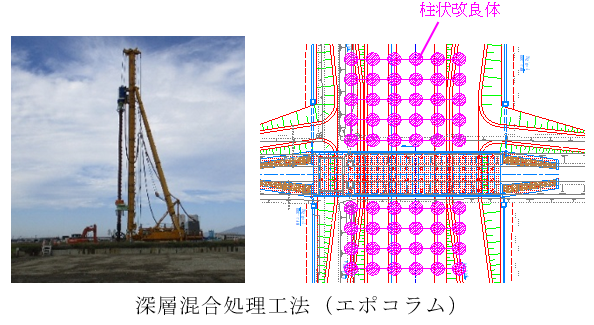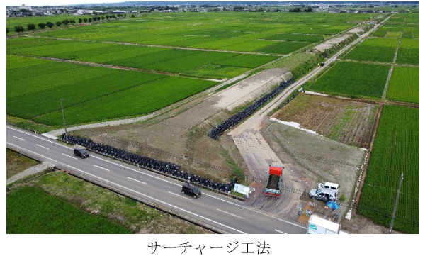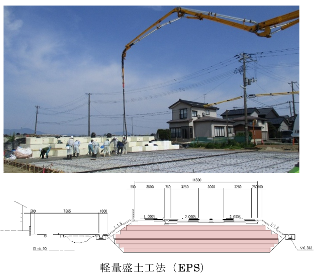 三条北道路の計画地は、丘陵と信濃川に挟まれた沖積平野の中央に位置し、周辺一帯は水田として利用されていました。信濃川、加茂川、丘陵からの中小河川により運搬堆積した氾濫原低地で軟らかい地盤であったため、軟弱地盤対策を施しながらの道路整備となりました。対策区間の多くは盛土荷重載荷により圧密沈下を促す工法(サーチャージ工法、プレロード工法)を採用しましたが、人家付近で宅地の引込沈下が懸念される箇所については軽量盛土工法、また、工程上、サーチャージ工法等の放置期間を確保できない箇所については、深層混合処理工法による地盤改良を行うなど、状況に応じた対策を実施しながら進めました。